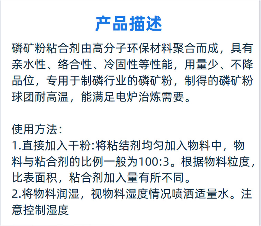 產品介紹:磷礦粉粘合劑由高分子環(huán)保材料聚合而成,具有親水性、絡合性、冷固性等性能,用量少、不降品位,專用于制磷行業(yè)的磷礦粉,制得的磷礦粉球團耐高溫,能滿足電爐冶煉需要。應用范圍:專用于磷礦粉。產品特點:1、專業(yè)性強:用于生產黃磷的磷礦粉。2、使用方便:粘……